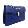 This is an authentic Bvlgari Serpenti Forever Shoulder Calfskin in Blue. This striking bag is crafted of calfskin leather. The bag features a front flap with an enameled snake head closure, gold hardware, and gold chain shoulder strap. The flap opens to a fabric interior with zipper and patch pockets.