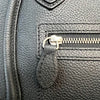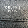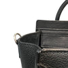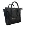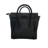 This is an authentic Celine Nano Luggage Drummed Calfskin in Black. This chic compact tote is made from grained black calfskin leather. It boasts rolled top handles, an optional shoulder strap adorned with aged silver clasps, a petite front zip pocket, and decorative leather accents. The top unzips to a black suede interior with a patch pocket.