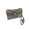 This is an authentic Gucci Dionysus Small Shoulder GG Supreme Monogram in Taupe. This stylish bag is crafted of Gucci GG monogram canvas. The shoulder bag features an aged ruthenium chain shoulder strap and a textured horseshoe closure with tiger heads at the end. The press lock closure opens to a suede flap front pocket and taupe suede lining and coated canvas zipper compartment.