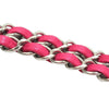 Dress up your everyday essentials in a gorgeous Chanel Medium Double Flap Tweed bag. This stylish flap bag is a brilliant eye candy and is crafted from woven fine tweed in pink and white. It has silver leather-threaded chain-link shoulder straps. A silver Chanel CC Mademoiselle turn lock opens to an interior with enough room for your day to night essentials.