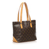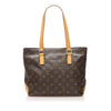 The Cabas Piano features a monogram canvas body, flat leather straps, a top zip closure, and interior zip and slip pockets.