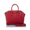 The Antigona features a leather body, rolled leather handles, a detachable flat leather strap, a top zip closure, and interior zip and slip pockets.