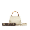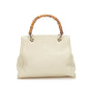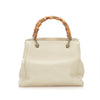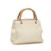 The Bamboo Shopper handbag features a leather body, bamboo top handles, an open top with a magnetic closure, and an interior zip and slip pockets.