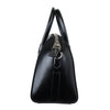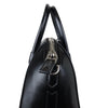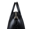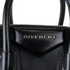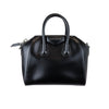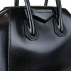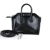 This is an authentic Givenchy Antigona Mini Shiny Calfskin in Black. This elegant model is made of polished calfskin leather in black. The bag features rolled leather top handles and a shoulder strap with polished silver hardware. The top zipper opens to a black fabric interior with a zipper and flat pockets.