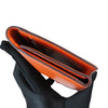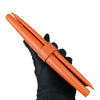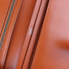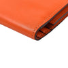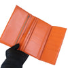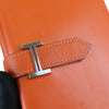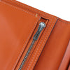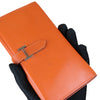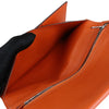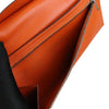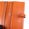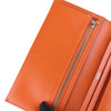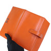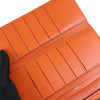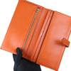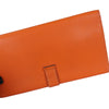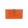 The Hermes Bearn wallet features a leather body, a side strap with a slip-in closure, an interior zip compartment, and interior slip pockets. Its orange colour makes for a striking yet simple look.
