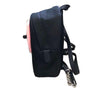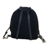 This backpack features a nylon body, a flat leather top handle, flat leather with chain back straps, a top zip closure, and an interior zip pocket.