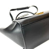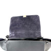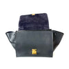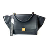 This CelineTrapeze satchel features a leather body, a rolled top handle, a detachable shoulder strap, a front flap with clasp closure, a top zip closure, and interior slip pockets.