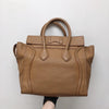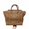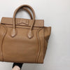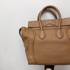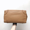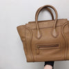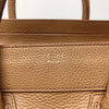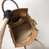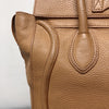 This Celine Mini Luggage in Beige is a stylish bag with rolled leather handles, a front zipper with sturdy and sleek trim. The interior is made of leather and has a zipper and patch pockets. It has a zipped closure and protective studs on the base.