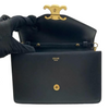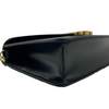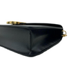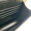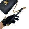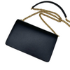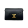 This is an authentic Celine Shiny Calfskin Triomphe Wallet on Chain in Black with Gold Hardware. The bag features a gold chain shoulder strap with a leather shoulder pad, and a gold press lock on the crossover flap. This bag opens to a black leather interior with a card slots and patch pocket.