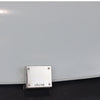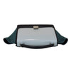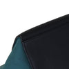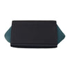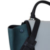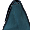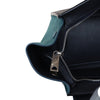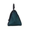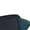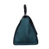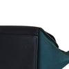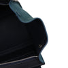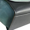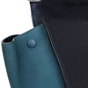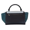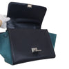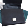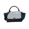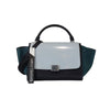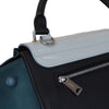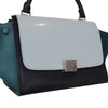 The Celine Trapeze features a baby blue patent top flap, A black leather body, emerald green sides, a rolled top handle, a detachable flat strap.