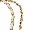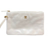 This is an authentic Chanel 22 Small Shiny Calfskin Quilted in White. It’s a white calfskin leather bag with diamond-stitched detailing. The gold-plated chain shoulder straps are threaded with leather, and there’s a black Chanel logo on the front. The top opens with a magnetic closure, revealing a beige fabric interior with a pocket and a removable pouch.