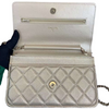 This Chanel 21P Calfskin Gold Wallet on Chain features a flap enclosure to maximize space and increase security for your items. Adorned with an iconic Quilted leather, this WOC is a nod to Chanel's classic chic style. Snatch up this rare gold find!