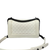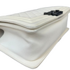 This Chanel Old Medium Le Boy is a perfect bag for any Collectors closet.  This bag is crafted in gorgeous Quilted white Calfskin Leather and accentuated with black toned Hardware, a perfect colour combination to match any outfit and suit any occasion.  A Chanel Boy must-have! Don't miss your chance to own this stunning piece of Chanel craftsmanship.