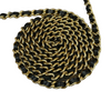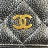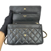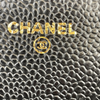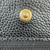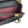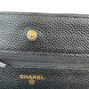 This Caviar Chanel Wallet on Chain features a black caviar quilted leather body, a leather woven gold-tone chain strap, a front flap with a snap closure, and interior zip and slip pockets.