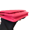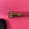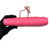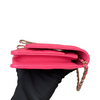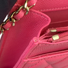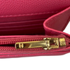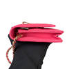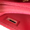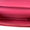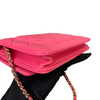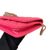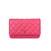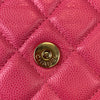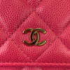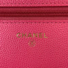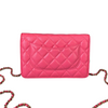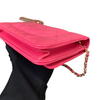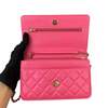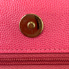 This Chanel Caviar Wallet on Chain features a pink caviar quilted leather body, a leather woven gold-toned chain strap, a front flap with a magnetic closure, and interior zip and slip pockets.