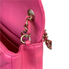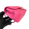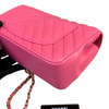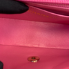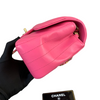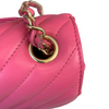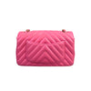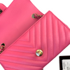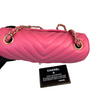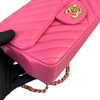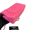 This stunning Chanel Classic Mini Rectangle Flap in Pink Chevron Lambskin leather with gold hardware is a must-have for any Chanel collector. It features a woven chain strap, which can be worn crossbody or doubled up to wear as a shoulder bag, and Chanel’s signature smile pocket on the back. This is the perfect bag to add a touch of fierce femininity to your outfits.