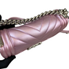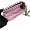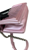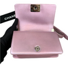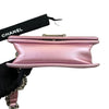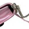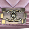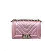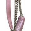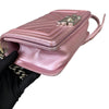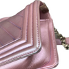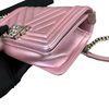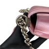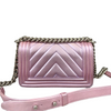 This Chanel Small Boy Flap is made of chevron-quilted Iridescent pink lambskin leather with a structured linear trim. It has a silver chain-link shoulder strap with a leather shoulder pad that provides versatility and effortless elegance. This stunning shoulder bag is a day-to-night classy piece.