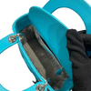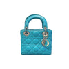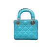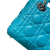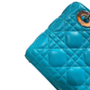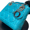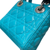 This Turquoise Christian Dior Cannage Quilted Mini Lady Dior is fashioned from geometric quilted patent leather. It has sturdy reinforced leather top handles, with an adjustable and detachable patent leather shoulder strap, and polished gold hardware including large links, eyelets, and a hanging Dior initials charm.