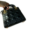 This Christian Dior Mini Lady Dior features the brand's classic geometric Cannage quilt in patent leather. It has sturdy reinforced leather top handles, with an adjustable and detachable patent leather shoulder strap, and polished gold hardware including large links, eyelets, and a hanging Dior initials charm. Truly a treat and a great addition to any luxury collection!