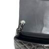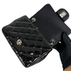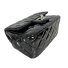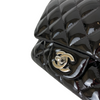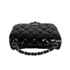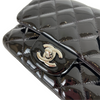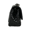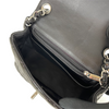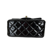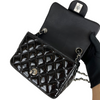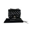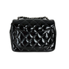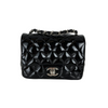 The Mini Square Classic Flap bag features a quilted patent leather body, a leather woven chain strap, a front flap with interlocking Cs and a twist lock closure, and an interior zip and slip pockets.