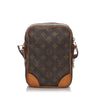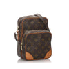 The Louis Vuitton Amazone features a monogram canvas body, a front exterior zip pocket, an adjustable shoulder strap, a top zip closure, and an interior slip pocket.