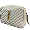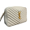 This is an authentic Saint Laurent Lou Camera Calfskin Matelasse Monogram in Off White. This stylish shoulder bag is made of calfskin leather and features an adjustable shoulder strap with aged gold hardware and a removable tassel. The top zipper opens the bag to a fabric interior with a flat pocket.