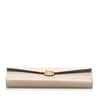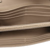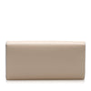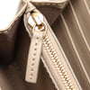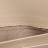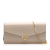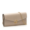 This wallet on chain features a leather body, a chain shoulder strap, a front flap with magnetic snap closure, and an interior zip and slip pockets.
