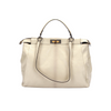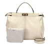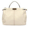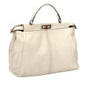 Fendi Peekaboo Leather Satchel White. The Peekaboo features a leather body, a flat leather handle, a detachable flat leather strap, an open top with twist closure, and an interior zip closure.