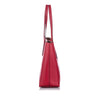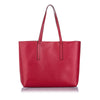 This tote features a leather body, flat leather straps, an open top, and an interior zip pouch.
