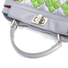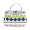 The Fendi Mini Peekaboo features an embroidered raffia body with leather trim, a flat top handle, a detachable flat strap, and a silver-tone turnbuckle closure.