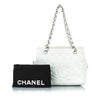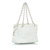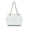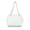 This tote bag features a caviar leather body, a gold-tone chain strap, a top zip closure, and interior zip and slip pockets.