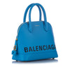 The Balenciaga Blue Ville satchel with a classic feature that has a detachable flat leather strap. It has a bold logo printed on either side. It was made from richly textured calf leather and features two toting handles, a top zip closure, interior slip with zip pockets, and a crossbody bag.