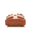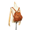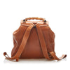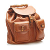 This Gucci Bamboo Drawstring Leather Backpack features a leather body, flat back straps, a bamboo top handle, a top flap with buckle closure, a drawstring closure, front exterior flap pockets with a bamboo twist lock closure, and an interior zip pocket.