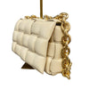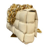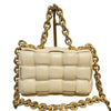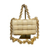 This is an authentic Bottega Veneta Padded Chain Cassette Calfskin in Beige. This stylish shoulder bag is crafted of soft padded and woven calfskin leather in beige. The bag features a gold chain shoulder strap. It opens to a matching leather interior with a zipper pocket.