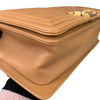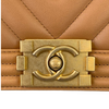 This Chanel Chevron Old Medium Boy bag in Caramel coloured calf leather with brushed gold hardware possesses all of Coco's original elements, the flap design, quilting, push lock in the center and adjustable chain to enable either single or double chain wear.
