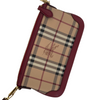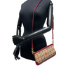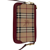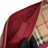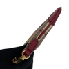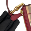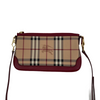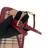 This Burberry crossbody bag features a canvas body with leather trim with traditional Burberry Haymarket Check coated canvas. The bag features an adjustable red leather crossbody strap with light brass hardware