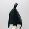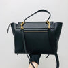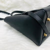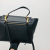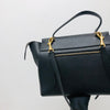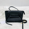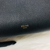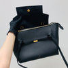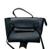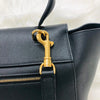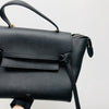 This Celine Mini Belt Bag is crafted of calfskin leather in black with a structured and spacious silhouette. The bag details a leather strap top handle, optional shoulder strap with brass hardware, and a front-facing flap that is decorated by knotted straps.