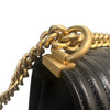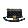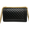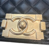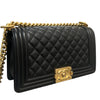 This is an authentic Chanel Boy Flap Medium Caviar Quilted in Black. This chic shoulder bag is crafted of diamond quilted caviar leather with a linear quilted border. The bag features a aged gold chain-link shoulder strap with a leather shoulder pad and a gold Chanel boy CC push lock. The flap opens to a black fabric interior with a pocket.
