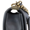 This is an authentic Chanel Boy Flap Medium Lambskin Quilted in Black. This chic shoulder bag is made of lambskin leather with signature diamond stitched quilting in black. The bag features a ruthenium shoulder strap with a leather shoulder pad and ruthenium facing Chanel Boy CC push lock. The flap opens to a black fabric interior with a patch pocket.