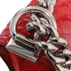 This is an authentic Chanel Boy Flap Old Medium Patent Quilted in Red. A stylish shoulder bag crafted from diamond-quilted patent leather with a peripheral linear trim. The bag features a silver chain link shoulder strap with a leather shoulder pad, and a unique red plexiglass squared press lock. The front flap reveals a black fabric interior with pockets.