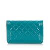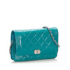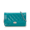 The Boy wallet on a chain features a quilted patent leather body, a leather woven chain strap, a front flap with magnetic snap closure, and interior zip and slip compartments.