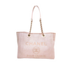 This fun and the fabulous bag makes the perfect everyday or travel tote! The Chanel Canvas Deauville Medium Shopping Tote Bag features a durable canvas body with the traditional Chanel logo stitched in baby pink on the front. The bag comes with chain and fabric entwined shoulder straps. This comfortable and lightweight jumbo tote will hold all your daily essentials in style.