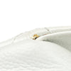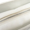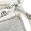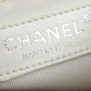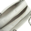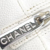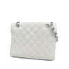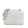 The Chanel Caviar Petite Timeless Shopping Tote in White features a caviar leather body, a back exterior slip pocket, curb chain handles, an open top with a magnetic snap button closure, and interior zip and slip pockets.