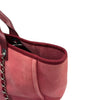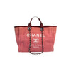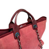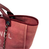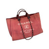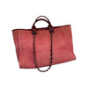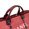 This is an authentic Chanel Deauville Tote Large Canvas in Red. This chic red tote is made of premium canvas and features a white logo. It has leather strap handles, silver chains woven with fabric, and a red fabric interior with zipper and patch pockets.