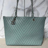 This Chanel Large Perforated Shopping Tote tote bag features a green perforated leather body, curb chain straps with silver hardware, and an open-top with detachable leather pouch.