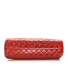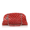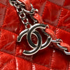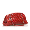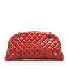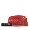 This Chanel Mademoiselle Bowling Bag Red features a quilted leather body, a silver-tone woven chain straps, an open top with magnetic closure, an interior zip compartment, and an interior slip pockets.