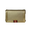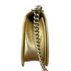 Stand out from the crowd with this Gold Cube Embossed Chanel Boy bag. Crafted in a luxurious gold lambskin leather. It features a chain shoulder strap with a leather shoulder pad and the iconic Boy CC closure. This is a great statement piece for any OOTD and a one of a kind addition to your collection.