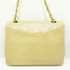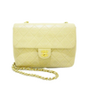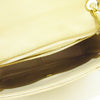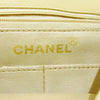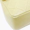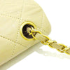 The Chanel Vintage Lambskin Mini Square Flap Beige GHW features a quilted lambskin leather body, a leather woven chain strap, a front flap with a CC turnlock closure, and an interior zip pocket.