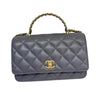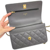 This is an authentic Chanel Wallet On Chain WOC Caviar Quilted in Grey. This stylish wallet is made of caviar leather. This shoulder bag features a polished gold chain-link crossbody strap and a polished gold Chanel CC logo on the top handle. The bag opens to a interior with a zipper compartment, card slots, and a patch pocket.