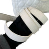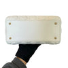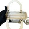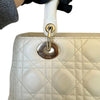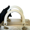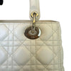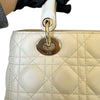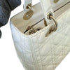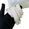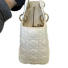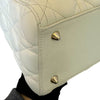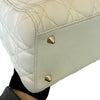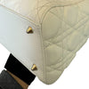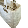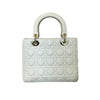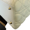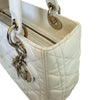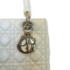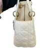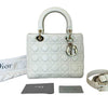 This is an authentic Christian Dior Lady Dior Medium Lambskin in White. This bag is made of lambskin leather. The bag has rolled leather handles, and a shoulder strap and silver hardware including a hanging silver "Dior" charm. The top zipper opens to a fabric interior with a zipper pocket.